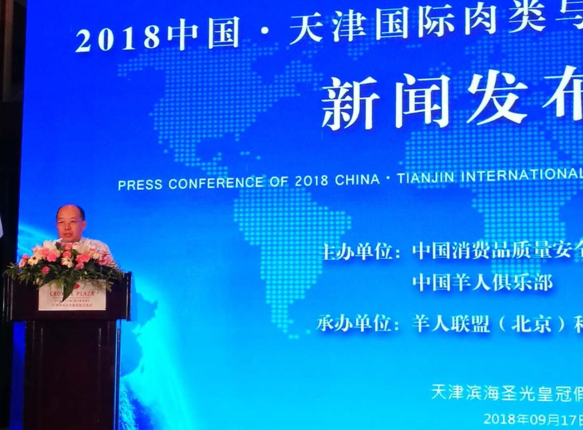 2018年9月17日,“2018天津國(guó)際肉類與食品進(jìn)出口博覽會(huì)”新聞發(fā)布會(huì)在天津?yàn)I海圣光皇冠假日酒店召開。中國(guó)消費(fèi)品質(zhì)量安全促進(jìn)會(huì)秘書長(zhǎng)曾召朋,天津市商務(wù)委員會(huì)副主任劉東水,內(nèi)蒙古農(nóng)牧業(yè)產(chǎn)業(yè)化龍頭企業(yè)協(xié)會(huì)執(zhí)行會(huì)長(zhǎng)林永亮,副會(huì)長(zhǎng)、內(nèi)蒙古大盛業(yè)羊絨制品有限公司總經(jīng)理魯耀武等相關(guān)負(fù)責(zé)人出席會(huì)議并致辭。
