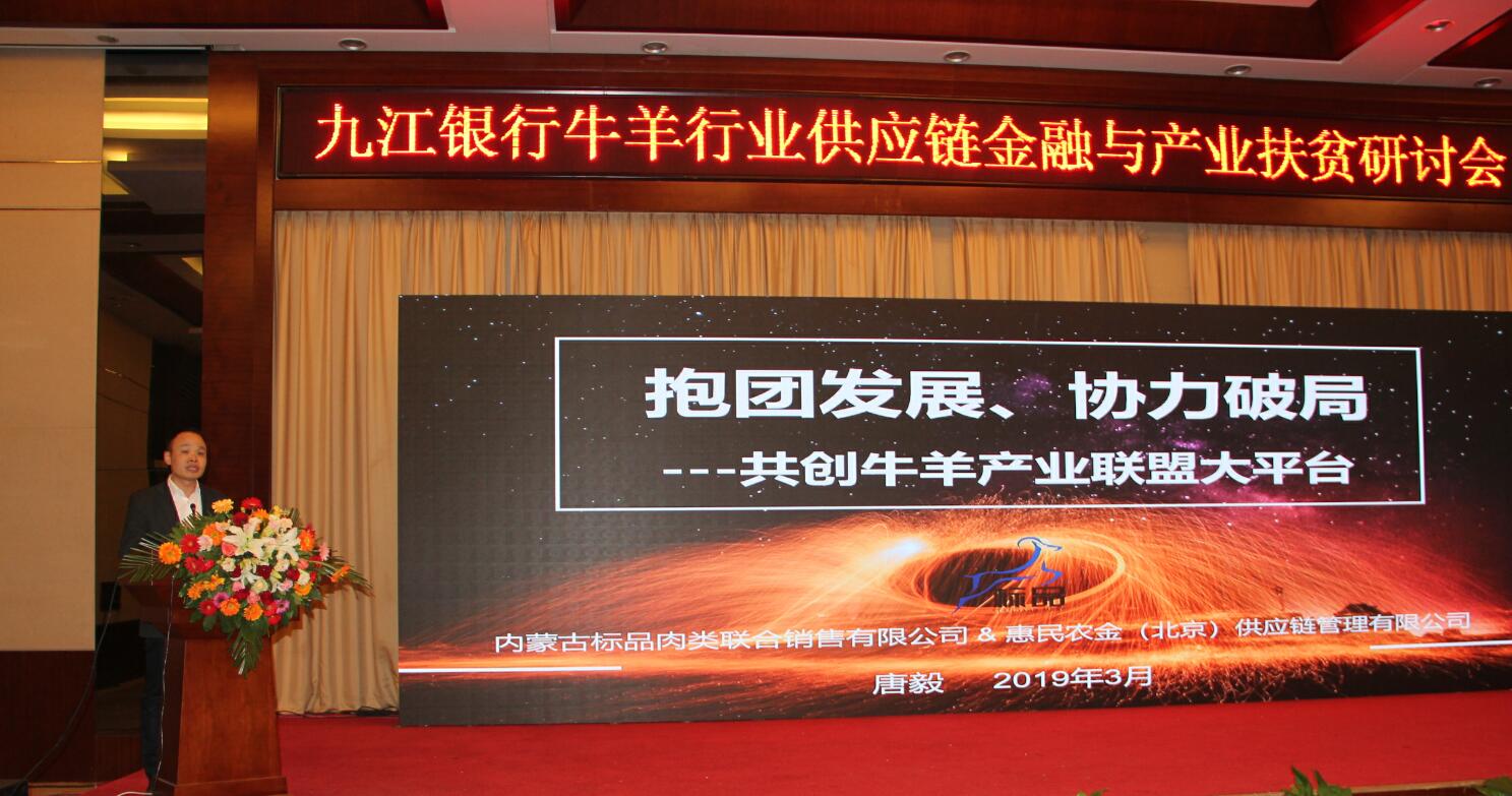 2019年3月15日,由九江銀行股份有限公司、內(nèi)蒙古農(nóng)牧業(yè)產(chǎn)業(yè)化龍頭企業(yè)協(xié)會(huì)、內(nèi)蒙古標(biāo)品肉類聯(lián)合銷售有限公司聯(lián)合主辦,主題為“產(chǎn)業(yè)聯(lián)盟謀發(fā)展,科技金融惠三農(nóng)”——牛羊行業(yè)供應(yīng)鏈金融與產(chǎn)業(yè)扶貧研討會(huì)在江西省九江市廬山西海隆重召開(kāi)。