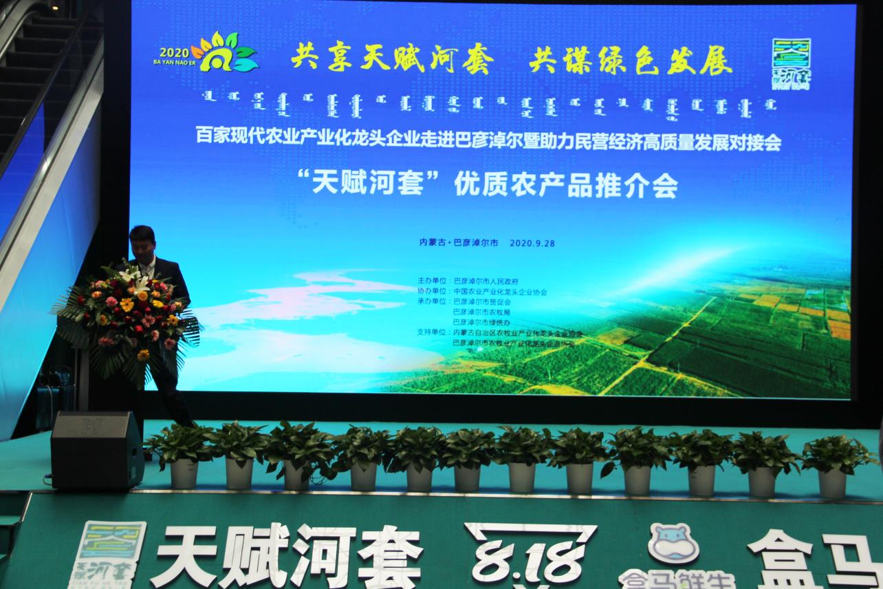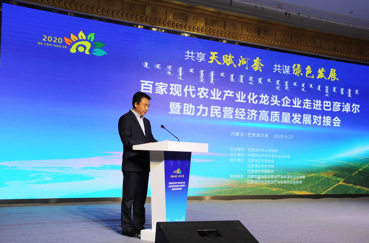 9月27日,由巴彥淖爾市人民政府主辦,中國農(nóng)業(yè)產(chǎn)業(yè)化龍頭企業(yè)協(xié)會協(xié)辦,巴彥淖爾市貿(mào)促會、巴彥淖爾市農(nóng)牧局、巴彥淖爾市綠統(tǒng)辦承辦,內(nèi)蒙古農(nóng)牧業(yè)產(chǎn)業(yè)化龍頭企業(yè)協(xié)會、巴彥淖爾市農(nóng)牧業(yè)產(chǎn)業(yè)化龍頭企業(yè)協(xié)會支持,以“共享‘天賦河套’·共謀綠色發(fā)展”為主題的百家現(xiàn)代農(nóng)業(yè)產(chǎn)業(yè)化龍頭企業(yè)走進巴彥淖爾暨助力民營經(jīng)濟高質量發(fā)展對接會在巴彥淖爾市臨河區(qū)召開。中國農(nóng)業(yè)產(chǎn)業(yè)化龍頭企業(yè)協(xié)會會長劉身利,中國農(nóng)科院紀檢組組長史志國,內(nèi)蒙古自治區(qū)黨委巡視二組駐巴彥淖爾市優(yōu)化營商環(huán)境專項工作組副組長董躍飛,巴彥淖爾市委副書記、市長張曉兵,市人大常委會主任閆鵬,市委副書記、政法委書記李中增,市委常委孫艾芳、王志平出席會議,副市長任逸群作市情推介,內(nèi)蒙古農(nóng)牧業(yè)產(chǎn)業(yè)化龍頭企業(yè)協(xié)會會長周勇應邀出席會議。