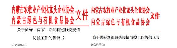 一、內(nèi)蒙古農(nóng)牧業(yè)產(chǎn)業(yè)化龍頭企業(yè)協(xié)會(huì)聯(lián)合內(nèi)蒙古綠色與有機(jī)食品協(xié)會(huì),先后發(fā)布了《關(guān)于做好“兩節(jié)”期間新冠肺炎疫情防控工作的倡議書(shū)》和《關(guān)于做好新冠肺炎疫情防控工作的倡議書(shū)》,引導(dǎo)各會(huì)員單位堅(jiān)決遏止借機(jī)囤積居奇、哄抬物價(jià)、虛假宣傳等破壞市場(chǎng)秩序、損害消費(fèi)者合法權(quán)益的不法行為,堅(jiān)決遏制疫情擴(kuò)展蔓延,積極投身新型冠狀病毒防控戰(zhàn)役中。