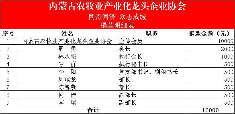 三、“一方有難,八方支援”,截止目前,在協(xié)會(huì)會(huì)長(zhǎng)周勇的帶領(lǐng)下,協(xié)會(huì)秘書(shū)處共募集抗疫捐款1.6萬(wàn)元,結(jié)合地方所需,已于2月23日以現(xiàn)款形式捐贈(zèng)給呼和浩特市紅十字會(huì),用于呼和浩特市疫情防控工作。