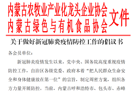 一、內(nèi)蒙古農(nóng)牧業(yè)產(chǎn)業(yè)化龍頭企業(yè)協(xié)會聯(lián)合內(nèi)蒙古綠色與有機食品協(xié)會,發(fā)布了《關(guān)于做好新冠肺炎疫情防控工作的倡議書》,引導(dǎo)各會員單位堅決遏止借機囤積居奇、哄抬物價、虛假宣傳等破壞市場秩序、損害消費者合法權(quán)益的不法行為,堅決遏制疫情擴(kuò)展蔓延,積極投身新型冠狀病毒防控戰(zhàn)役中。