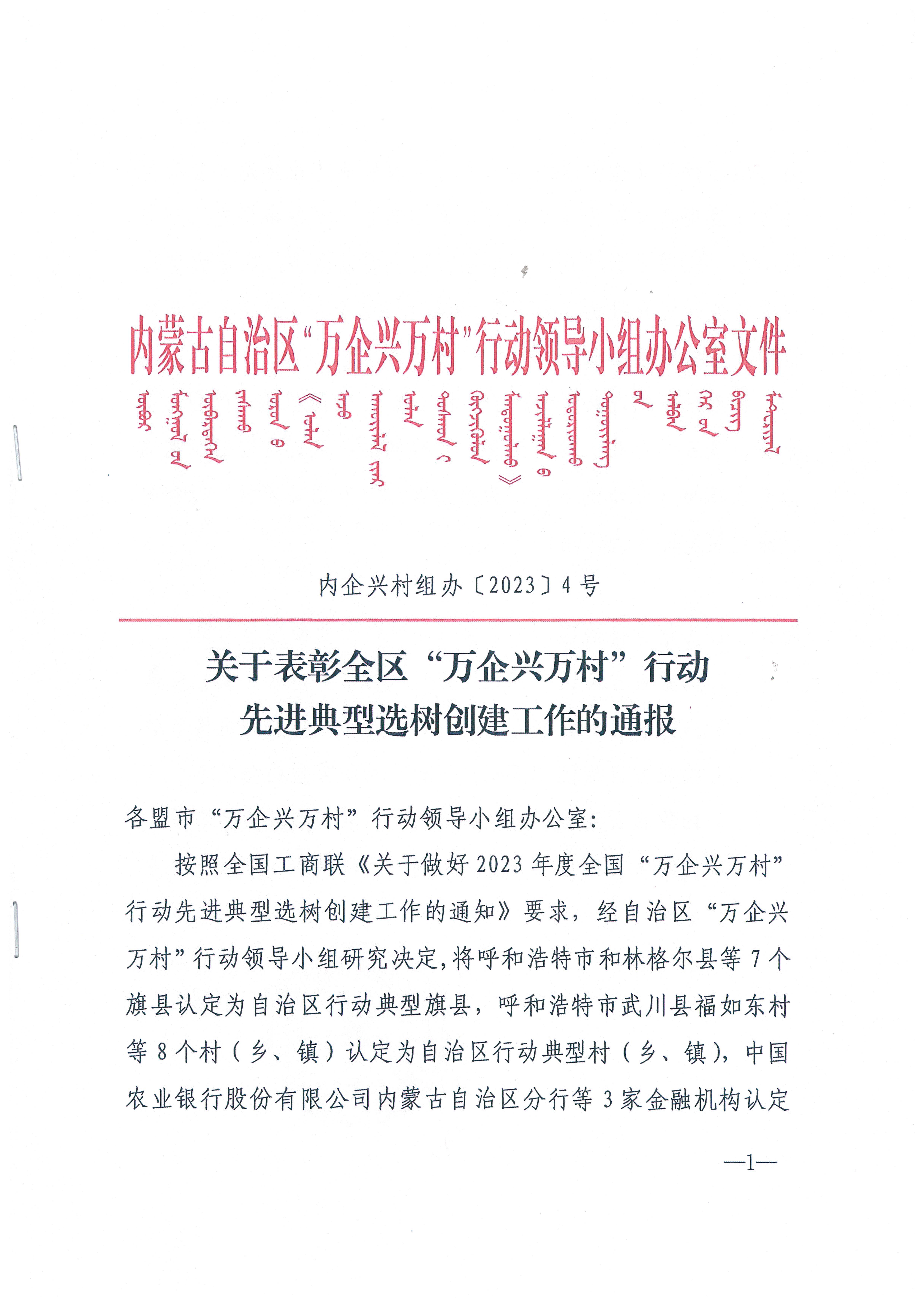 按照全國工商聯(lián)《關(guān)于做好 2023 年度全國“萬企興萬村行動(dòng)先進(jìn)典型選樹創(chuàng)建工作的通知》要求,經(jīng)自治區(qū)“萬企興萬村”行動(dòng)領(lǐng)導(dǎo)小組研究決定,將呼和浩特市和林格爾縣等 7個(gè)旗縣認(rèn)定為自治區(qū)行動(dòng)典型旗縣,呼和浩特市武川縣福如東村等8個(gè)村(鄉(xiāng)、鎮(zhèn))認(rèn)定為自治區(qū)行動(dòng)典型村 (鄉(xiāng)、鎮(zhèn)),中國農(nóng)業(yè)銀行股份有限公司內(nèi)蒙古自治區(qū)分行等 3 家金融機(jī)構(gòu)認(rèn)定為自治區(qū)行動(dòng)典型金融機(jī)構(gòu),內(nèi)蒙古農(nóng)牧業(yè)產(chǎn)業(yè)化龍頭企業(yè)協(xié)會(huì)等 3 家商會(huì)認(rèn)定為自治區(qū)行動(dòng)典型商會(huì),鄂爾多斯光彩事業(yè)基金會(huì) 1家基金會(huì)認(rèn)定為自治區(qū)行動(dòng)典型基金會(huì),內(nèi)蒙古蒙清農(nóng)業(yè)科技開發(fā)有限責(zé)任公司等 19 個(gè)項(xiàng)目(企業(yè))認(rèn)定為自治區(qū)行動(dòng)典型項(xiàng)目(企業(yè))
