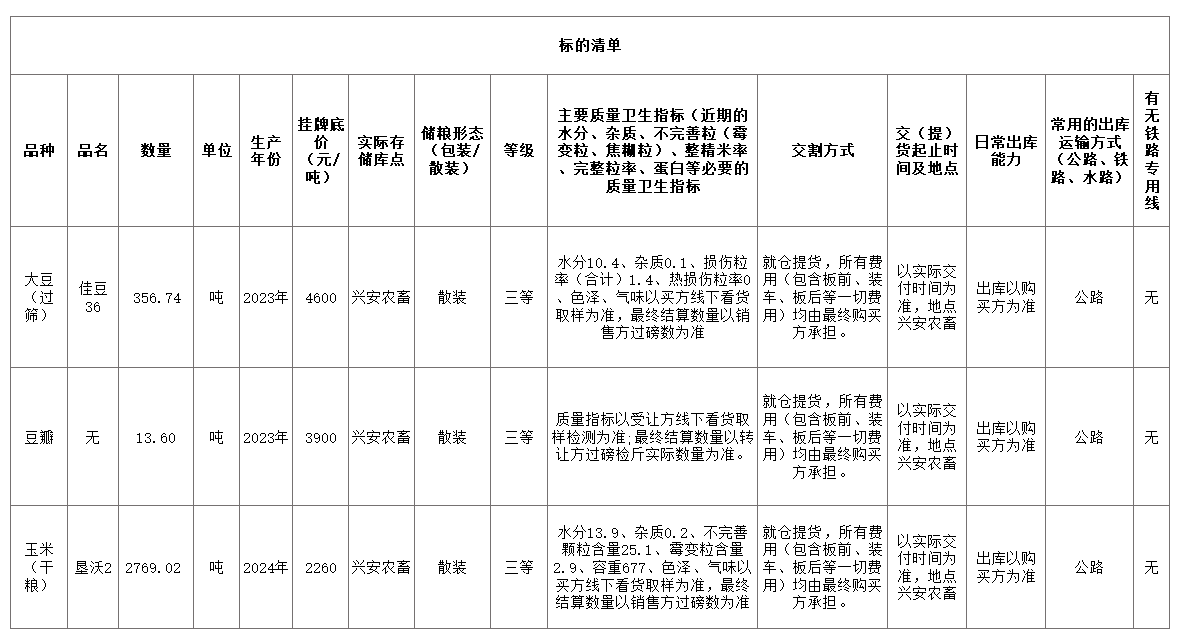 轉(zhuǎn)讓標(biāo)的為大豆(佳豆36)356.74噸、玉米(墾沃2)2769.02 噸、豆瓣13.6噸,標(biāo)的存放地位于呼倫貝爾市鄂倫春自治旗,詳情見標(biāo)的清單(含主要質(zhì)量指標(biāo)、存儲等信息):
