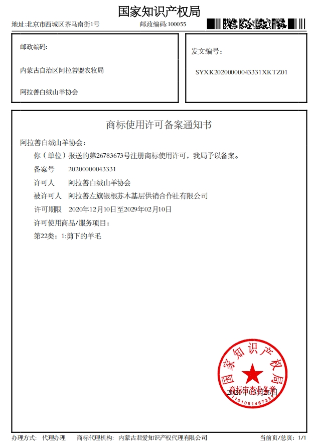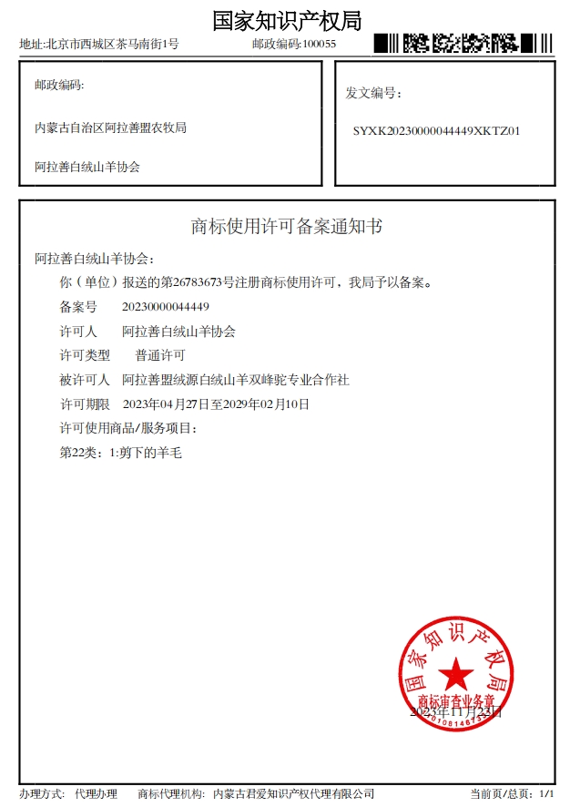阿拉善白絨山羊協(xié)會已收到國家知識產(chǎn)權局下發(fā)的4項商標使用許可備案通知書