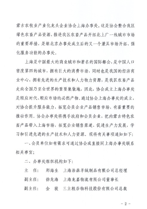 關(guān)于內(nèi)蒙古農(nóng)牧業(yè)產(chǎn)業(yè)化龍頭企業(yè)協(xié)會(huì)成立上海辦事處的通知