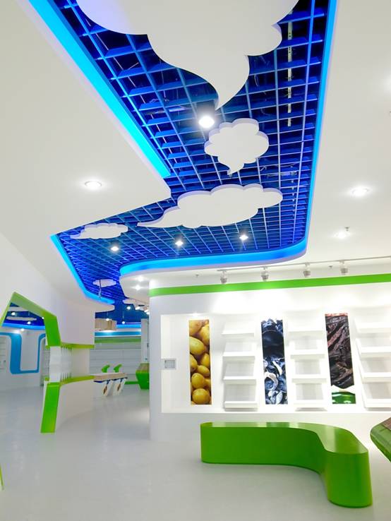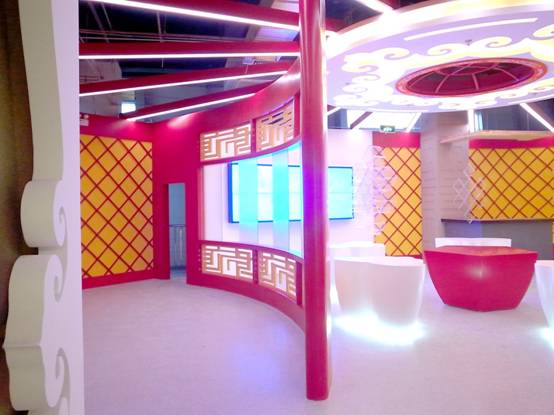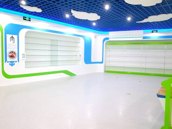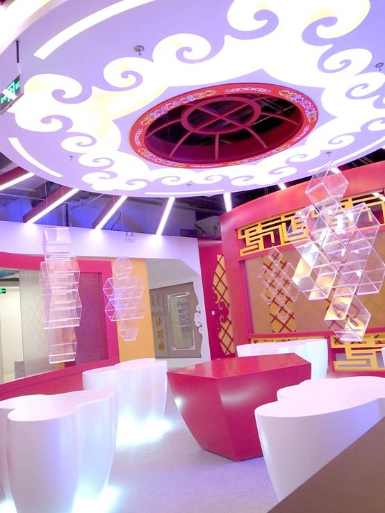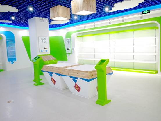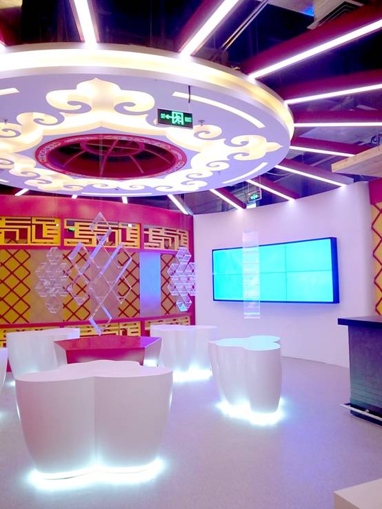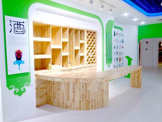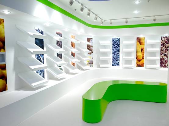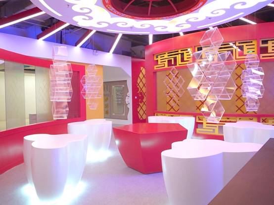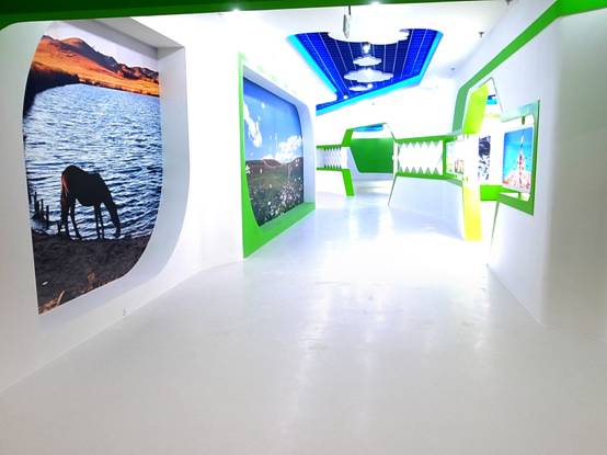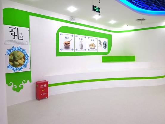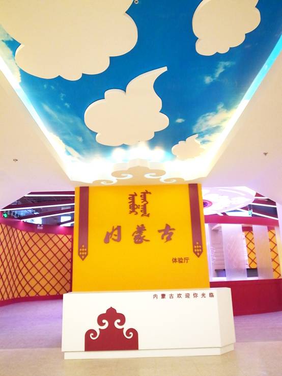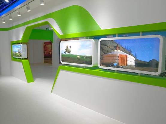 : 上海西郊國際內(nèi)蒙古館現(xiàn)場實景圖,現(xiàn)場分為展示區(qū)和體驗區(qū),展示區(qū)以產(chǎn)品展示銷售為主,現(xiàn)代科技結(jié)合時尚展廳設(shè)計風格,藍綠白相結(jié)合,映襯藍天、白云、草原;體驗區(qū)突出體驗品嘗、商務洽談功能,以現(xiàn)代蒙古包造型設(shè)計,突出民族氣息,展現(xiàn)內(nèi)蒙古特色。